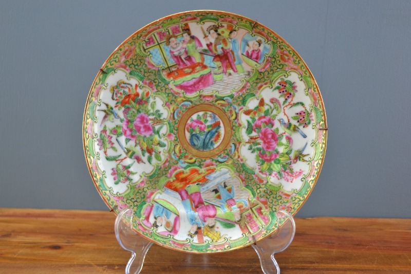 The quality of this plate is particularly good, with delicate gold details, indicating an earlier date. Rose medallion was one of several standard patterns developed during the second half of the 19th century. Apart from one minute frit, the condition of the plate is excellent. The underneath shows evidence of kiln grit. As is usual with Chinese export porcelain, it is unmarked.