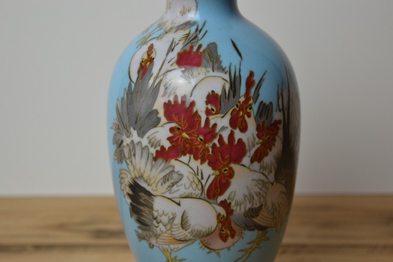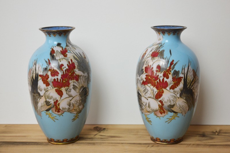A fine pair of vases with a flock of cockerels on turquoise with a single cockerel to the back. Unsigned, but with the shippo or wireless technique developed by Namikawa Sosuke (1847–1910). Renowned for his bird and flower pictures, the wires, or cloisons, are used to pick out details or are otherwise done away with completely to give the depiction a distinctive painterly quality.