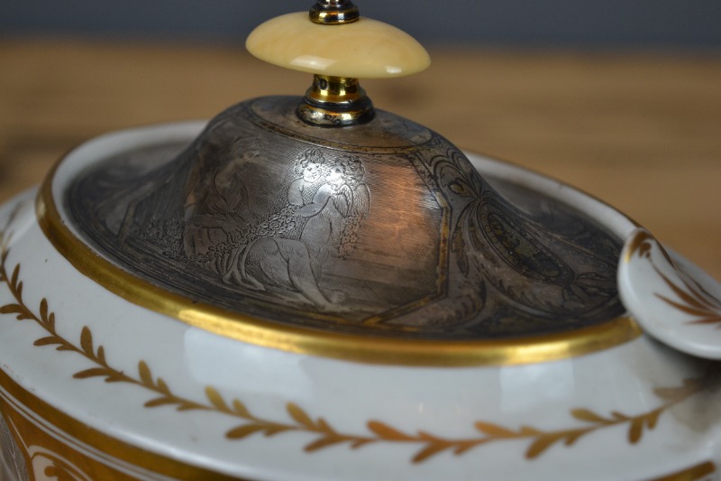 Miles Mason Teapot with Hand Engraved Silver on Copper Lid by Frederick Elkington and Sugar Bowl with Lid, Pattern 128, C. 1800-1805