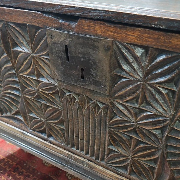 Oak Coffer With 17th Century Carved Front Panel And Deed/Inventory Inside Dated 1649