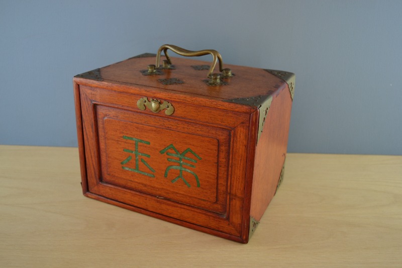 Beautiful example of a 1920s export set of Mahjong tiles made of bone and bamboo in a dove-tailed wooden box with brass mounts and carrying handles, sliding lid to the front with Chinese characters.