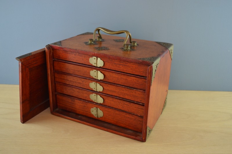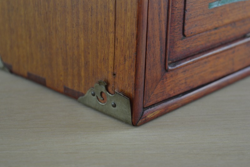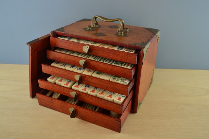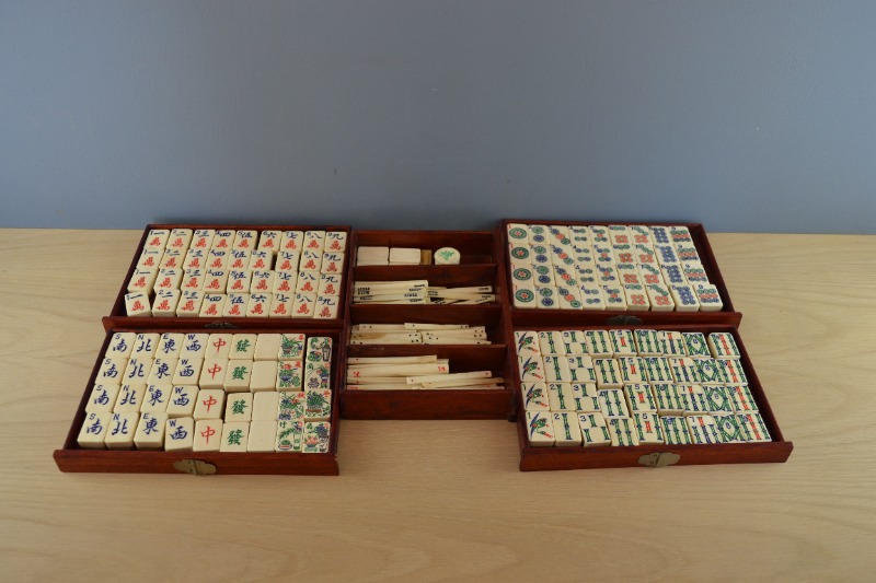 The set comprises 36 circle tiles, 36 bamboo tiles, 36 character tiles and 36 honour tiles. The honour tiles are made up of 16 winds (N, S, E, W), 4 Red Dragons, 4 Green Dragons, 4 White Dragons (i.e. blank) and 8 bonus seasons tiles (red series and green series). In the bottom of the five drawers are bone scoring sticks, four spare tiles, four miniature bone dice (in a wooden box with a sliding lid) and a ‘Ming’ box with four wind discs.