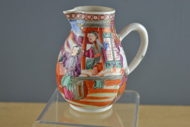 Finely painted Chinese sparrow beak jug made for the export market showing a lady seated at her table with servants in famille rose palette in what is known as the ‘Mandarin’ pattern. Diaper pattern and cartouches by the handle. This would have had a lid, hence the unglazed area to the inner rim.